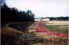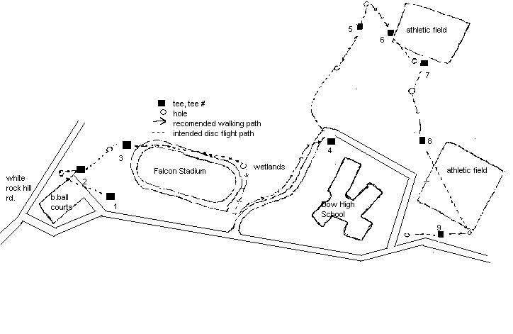 Hole 3- The Hail Mary par 4 Go long! This hole, the longest disc golf hole in New Hampshire, gives the thrower a panoramic view of the high school from a steep bluff above Falcon Stadium. The 50 ft. drop to the football field is helpful in the first throw, or play along the banking for a safer shot.
